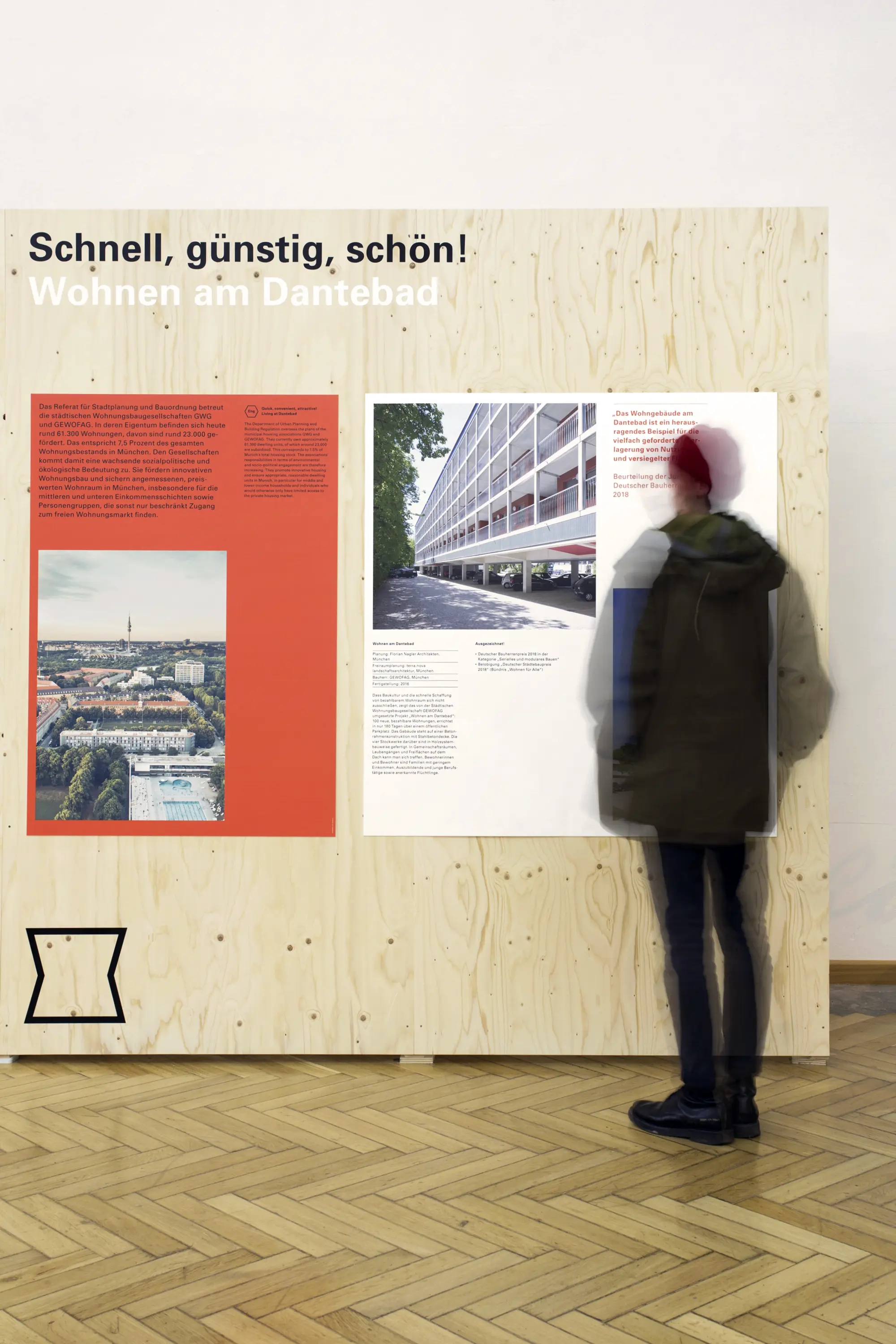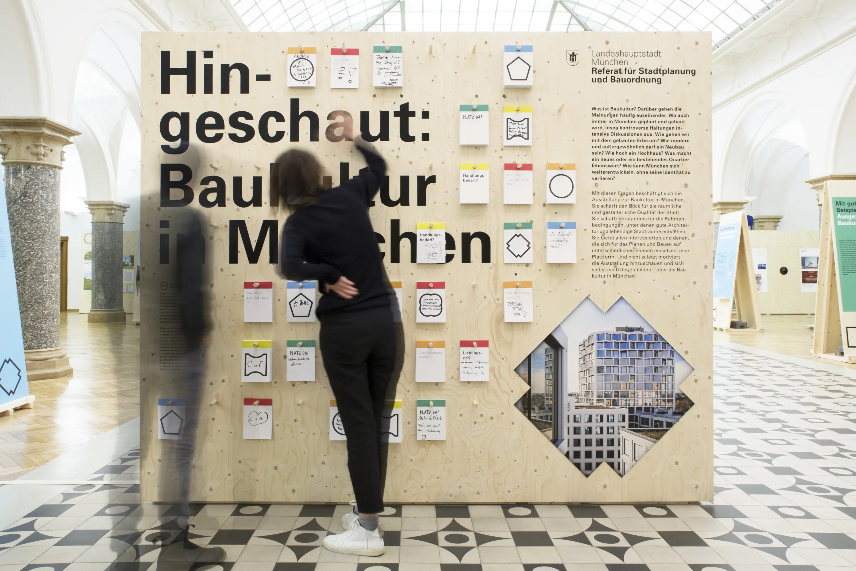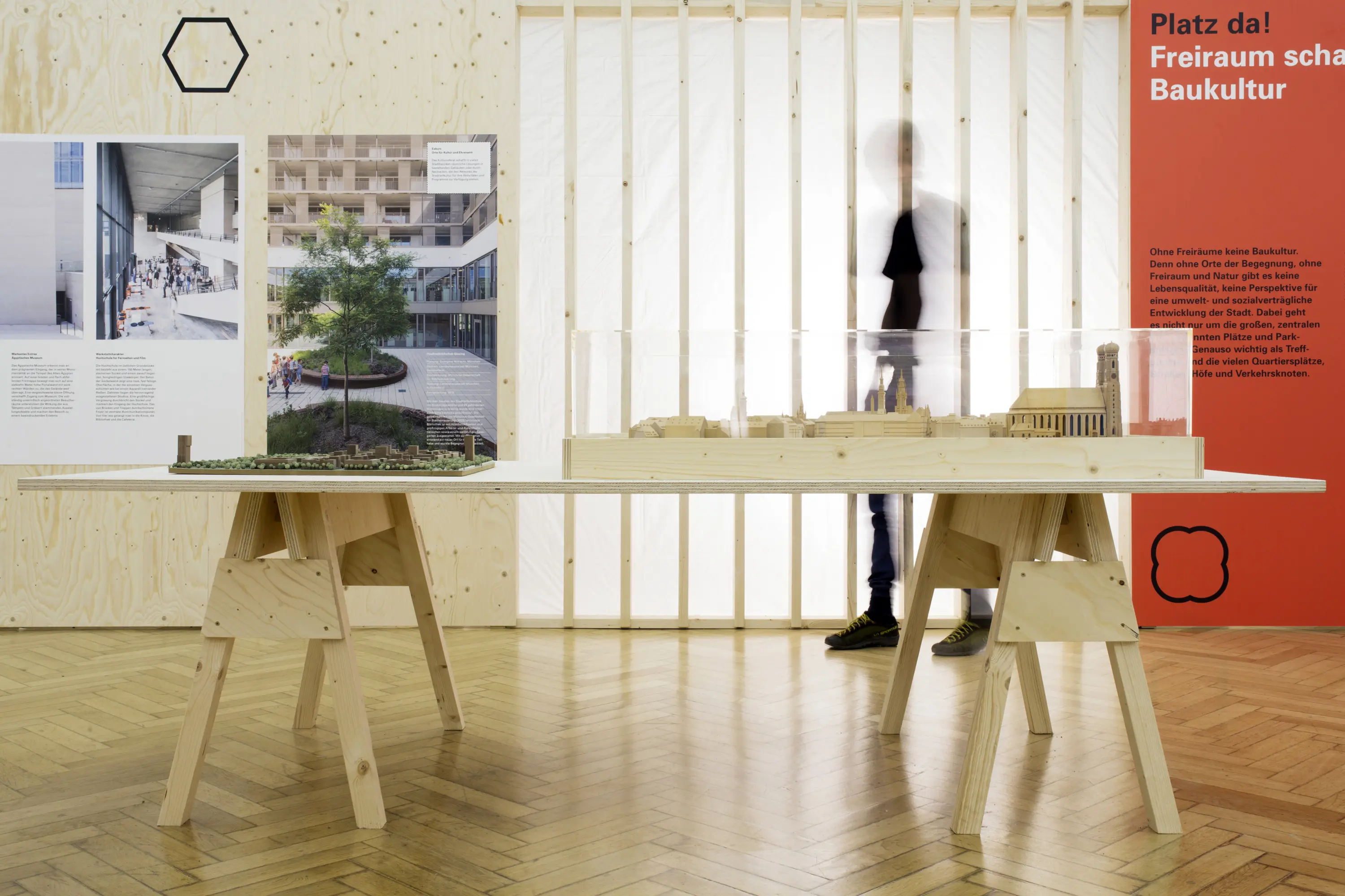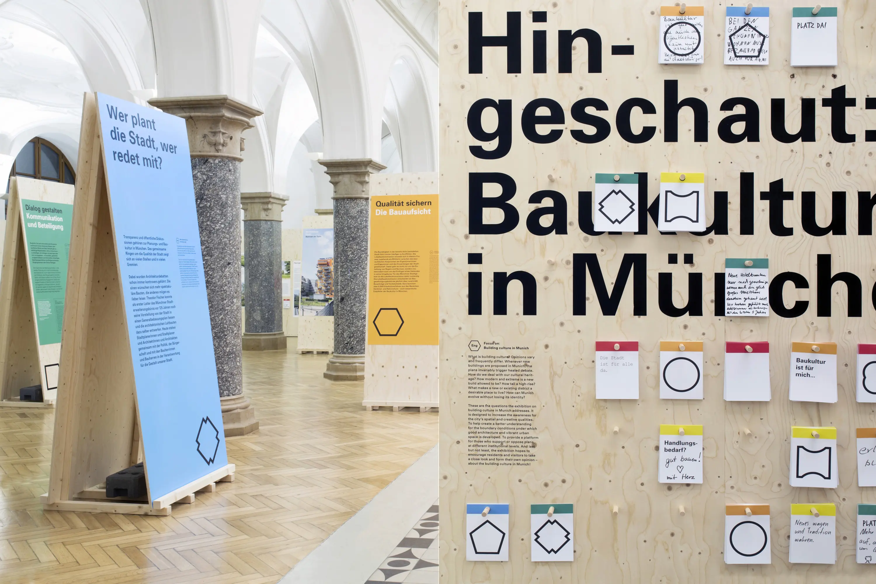 Die Ausstellungsarchitektur bestand aus einer umlaufenden Holzwand und frei stehenden Stelen. Auf Monitoren liefen Kurzfilme. Eine große Holzwand im Eingangsbereich bot Karten für Besucheräußerungen zur Baukultur. Auf einem Luftbild von München konnten die Besucher:innen ihre Lieblingsorte markieren.