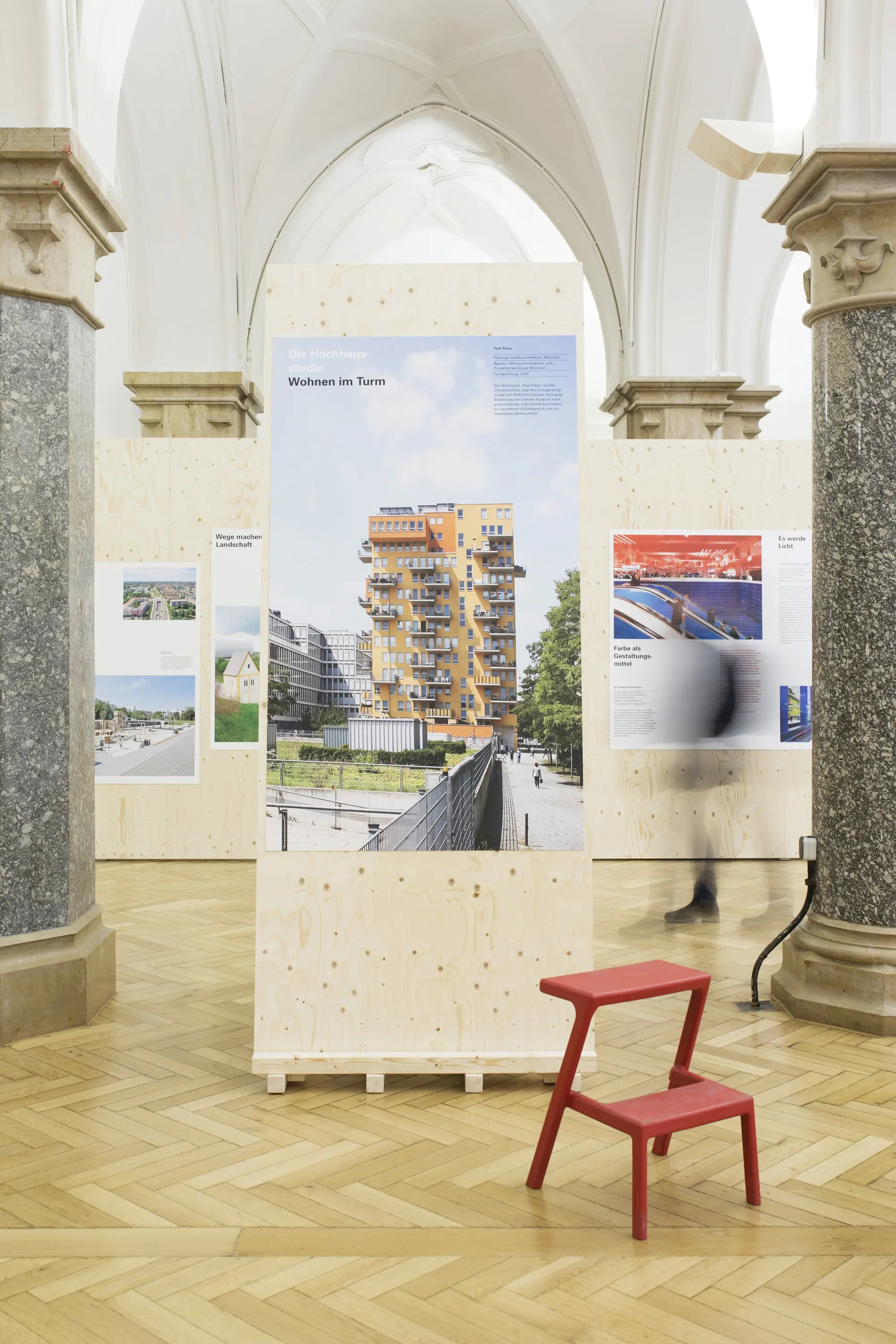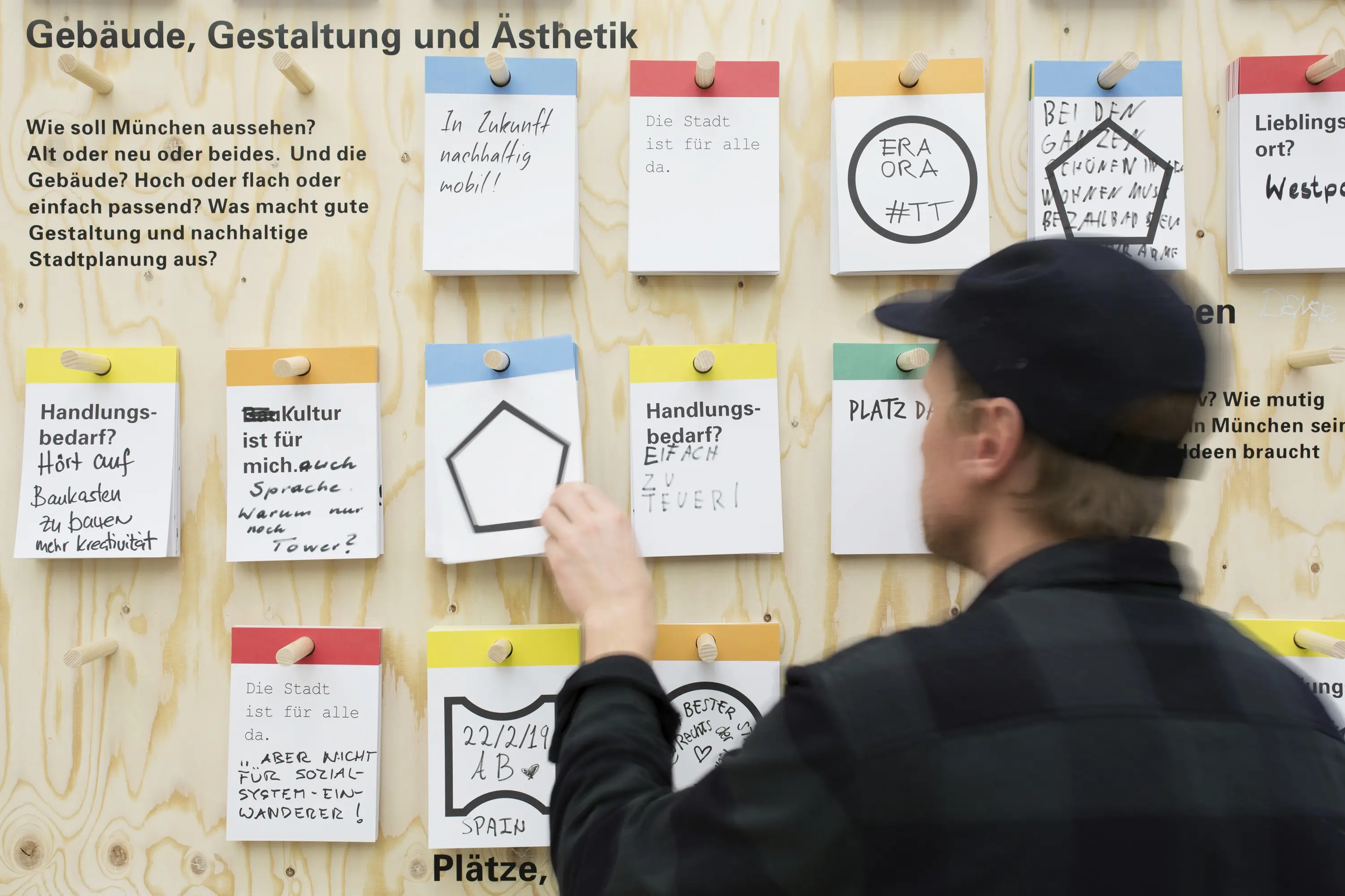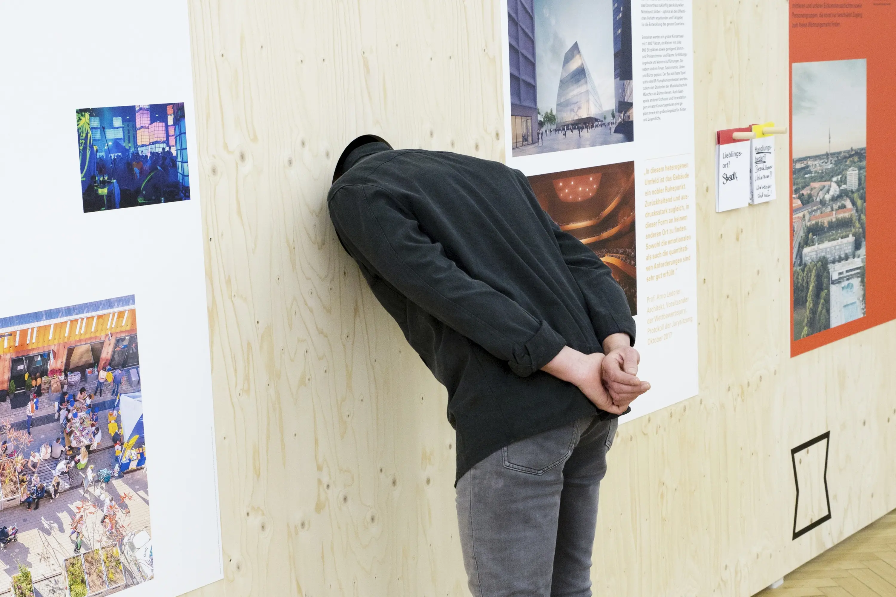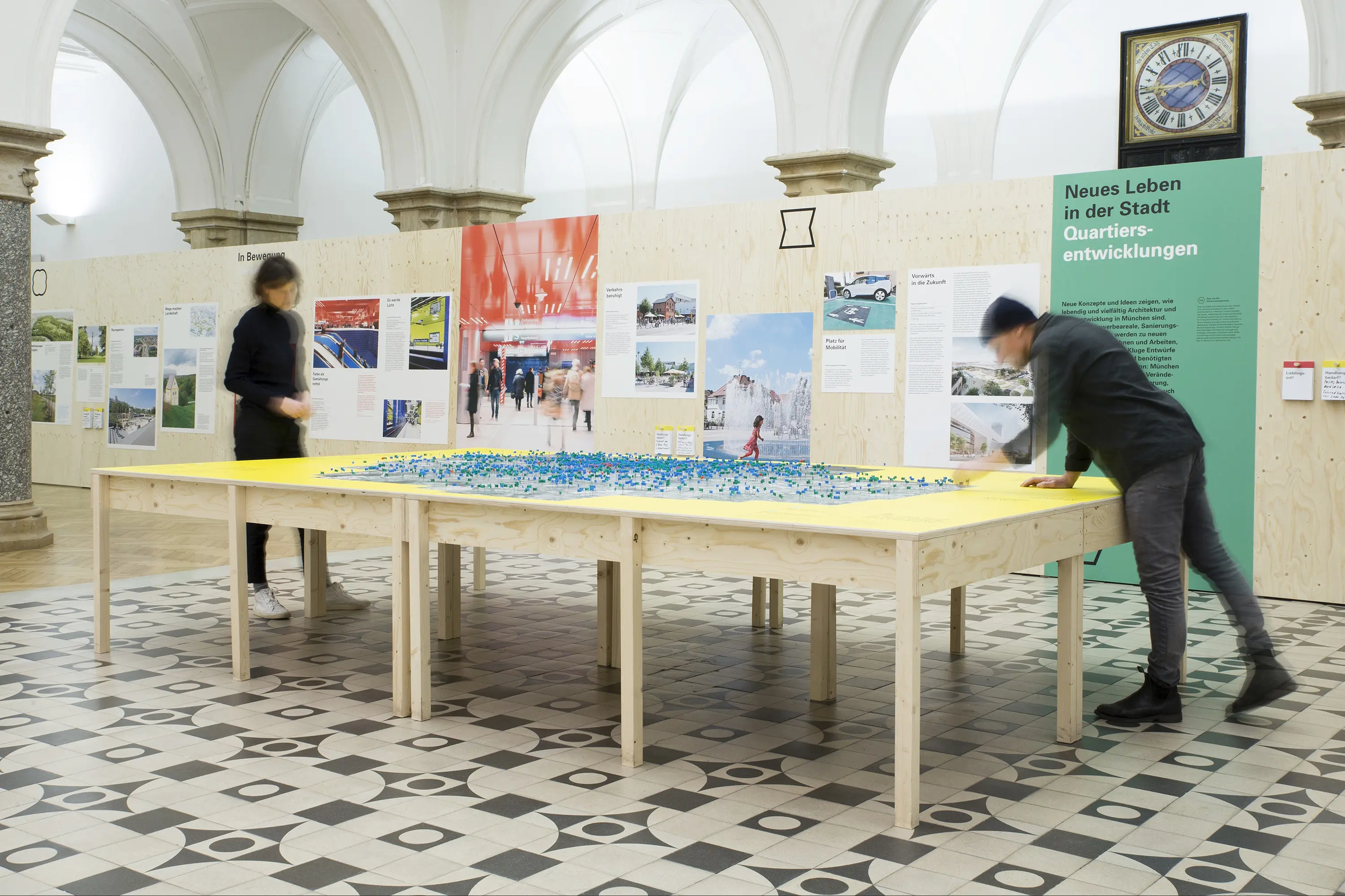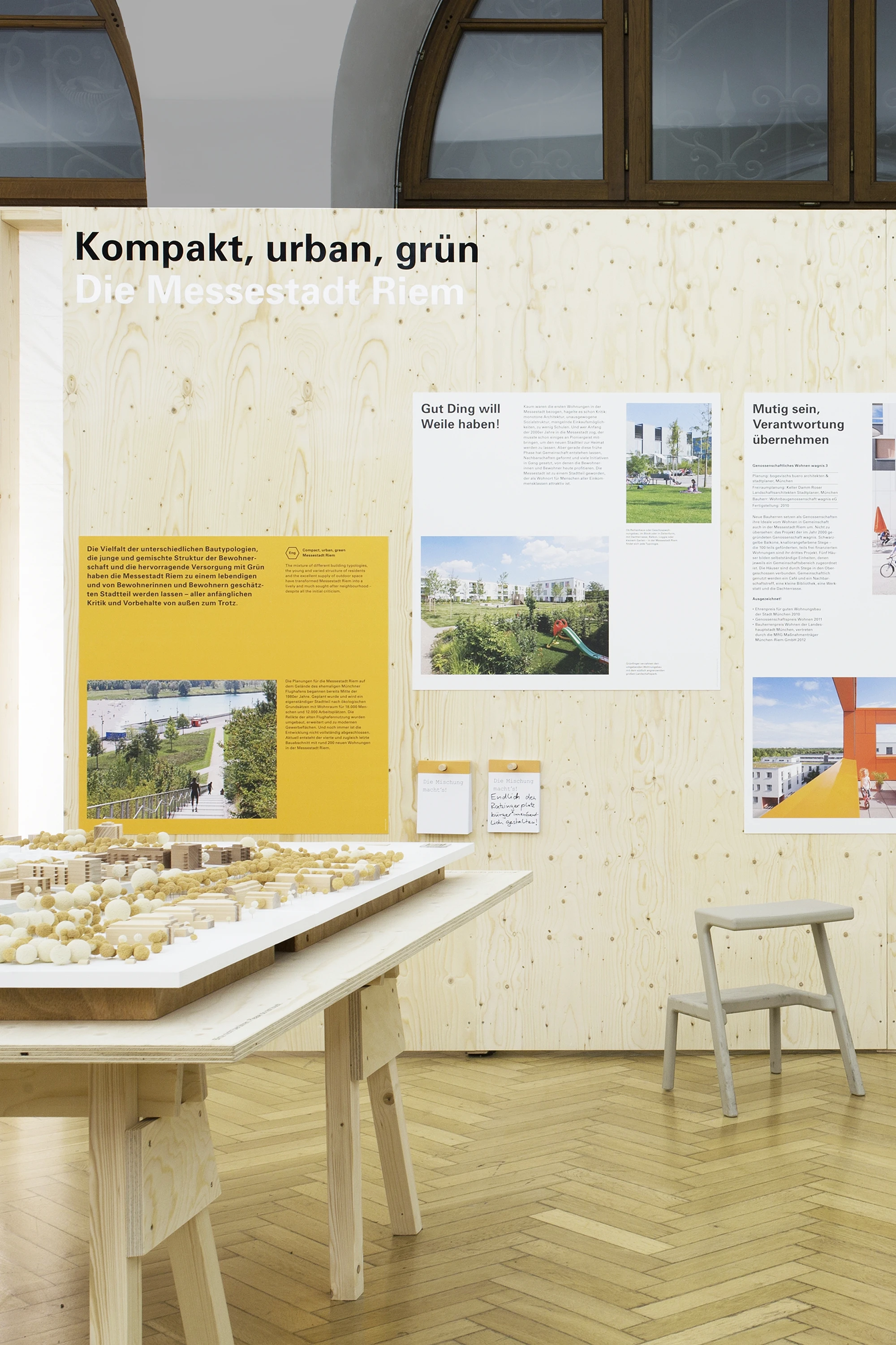 Die Ausstellungsarchitektur bestand aus einer umlaufenden Holzwand und frei stehenden Stelen. Auf Monitoren liefen Kurzfilme. Eine große Holzwand im Eingangsbereich bot Karten für Besucheräußerungen zur Baukultur. Auf einem Luftbild von München konnten die Besucher:innen ihre Lieblingsorte markieren.