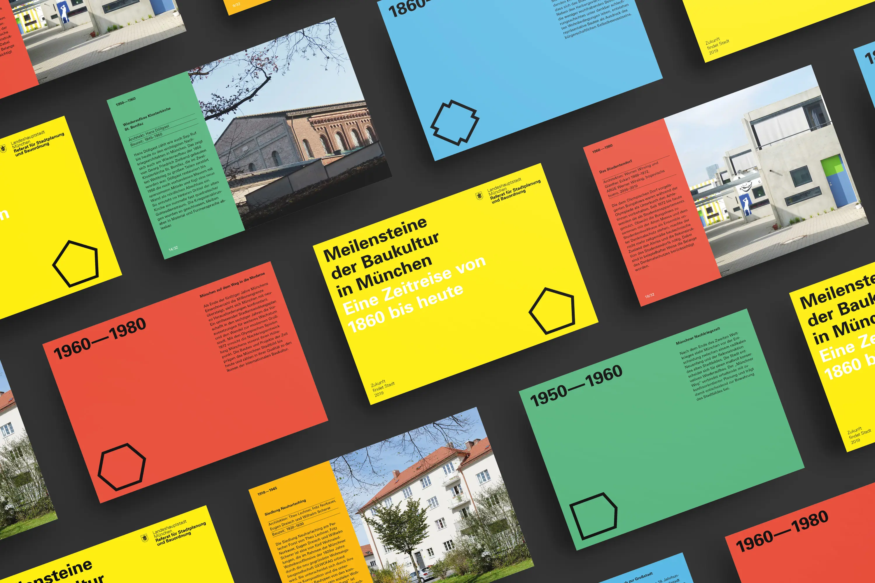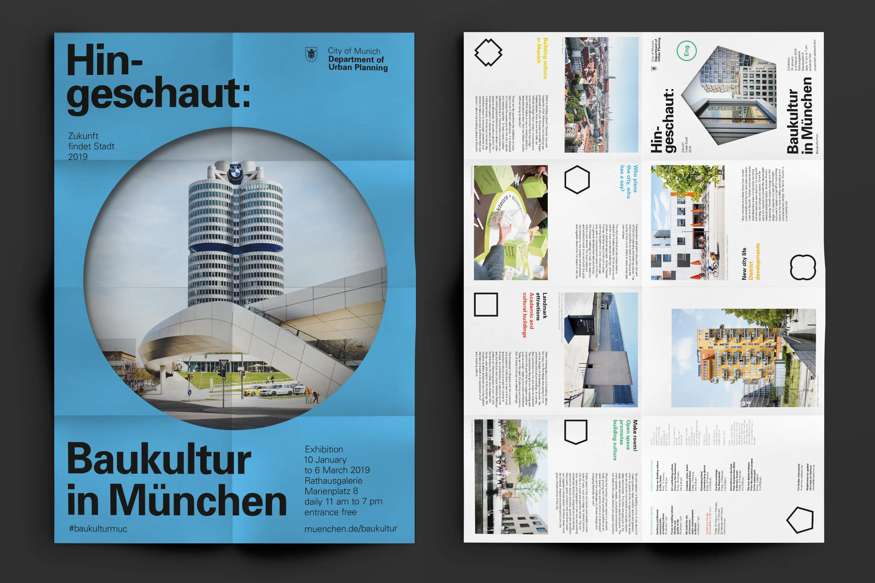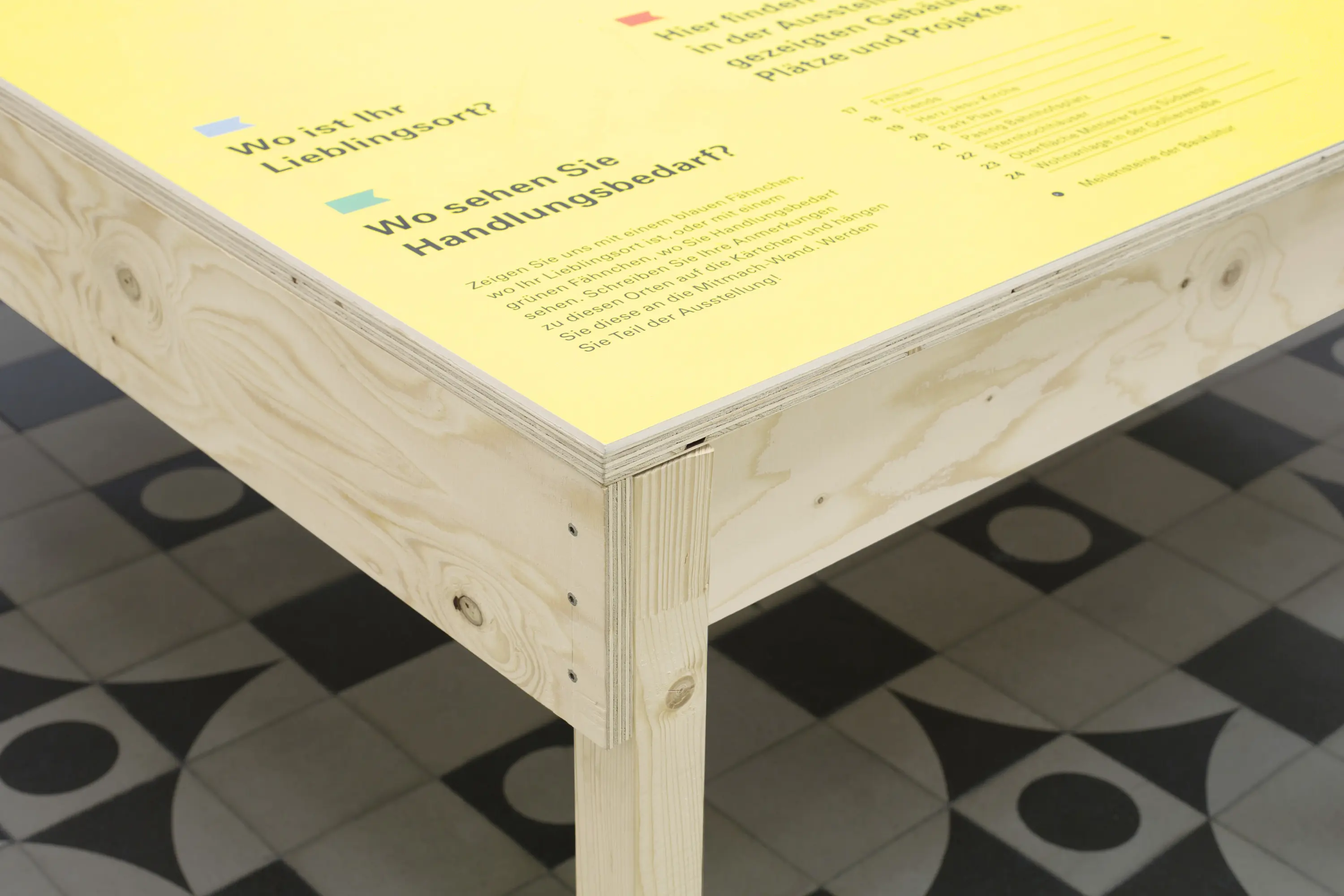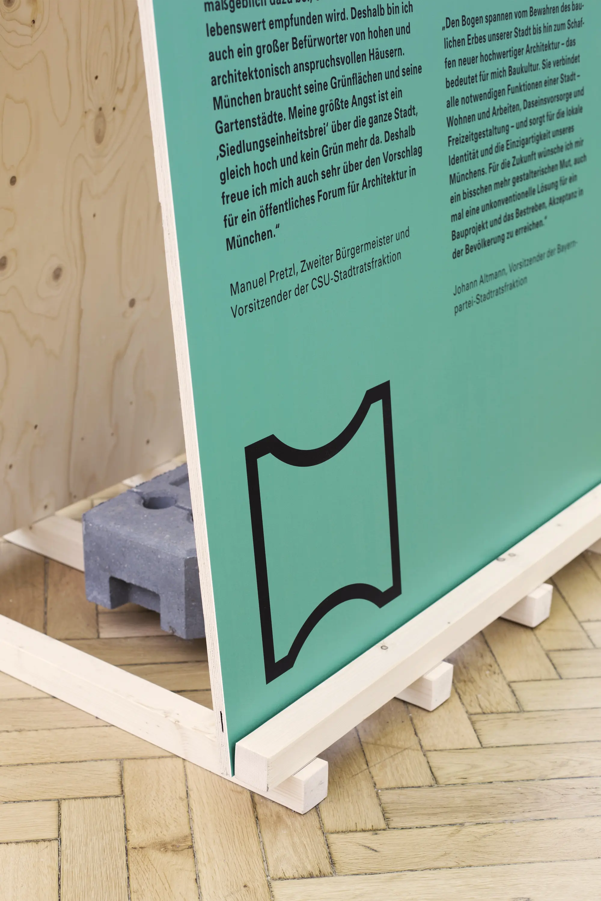 Die Ausstellungsarchitektur bestand aus einer umlaufenden Holzwand und frei stehenden Stelen. Auf Monitoren liefen Kurzfilme. Eine große Holzwand im Eingangsbereich bot Karten für Besucheräußerungen zur Baukultur. Auf einem Luftbild von München konnten die Besucher:innen ihre Lieblingsorte markieren.