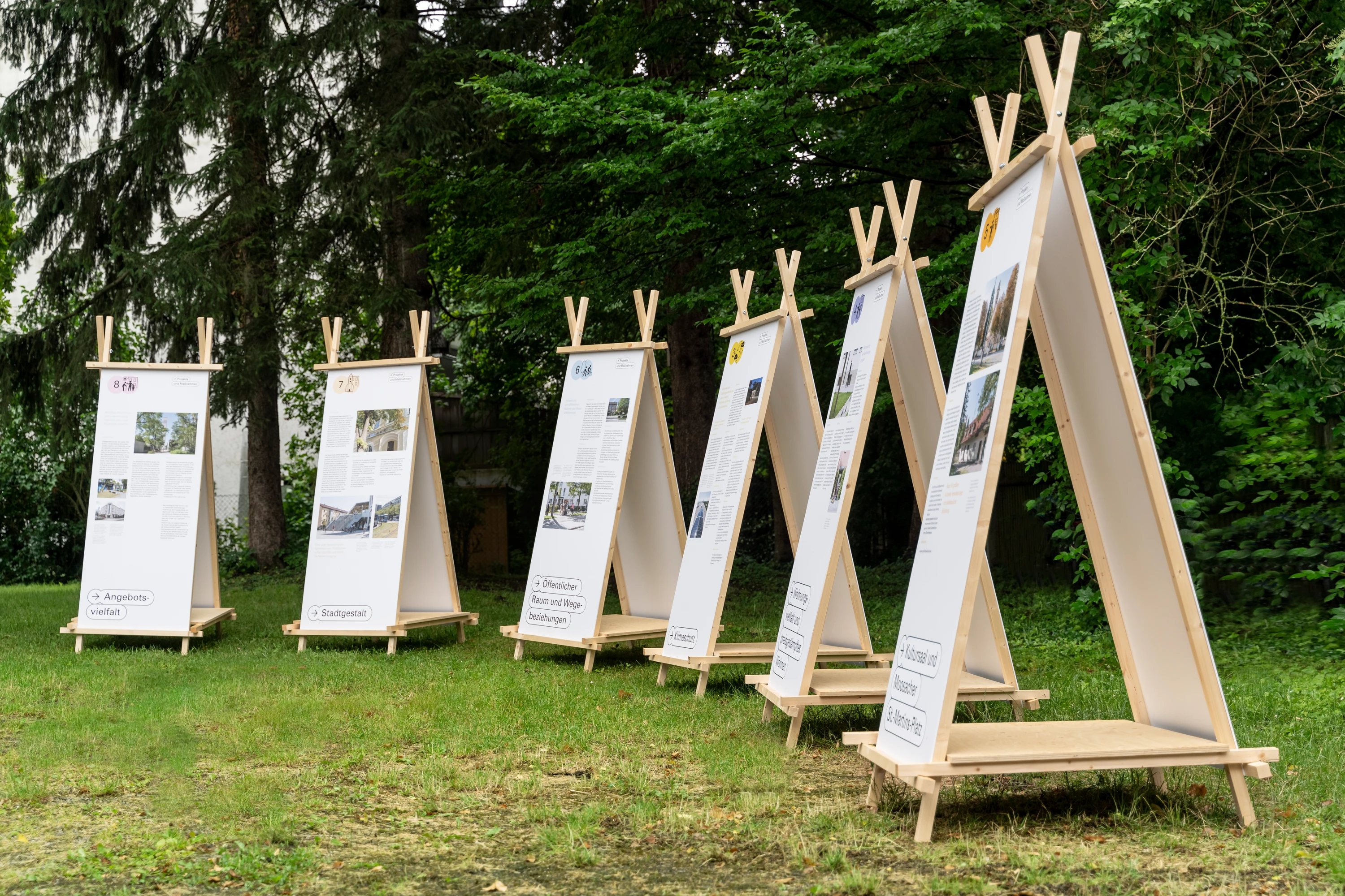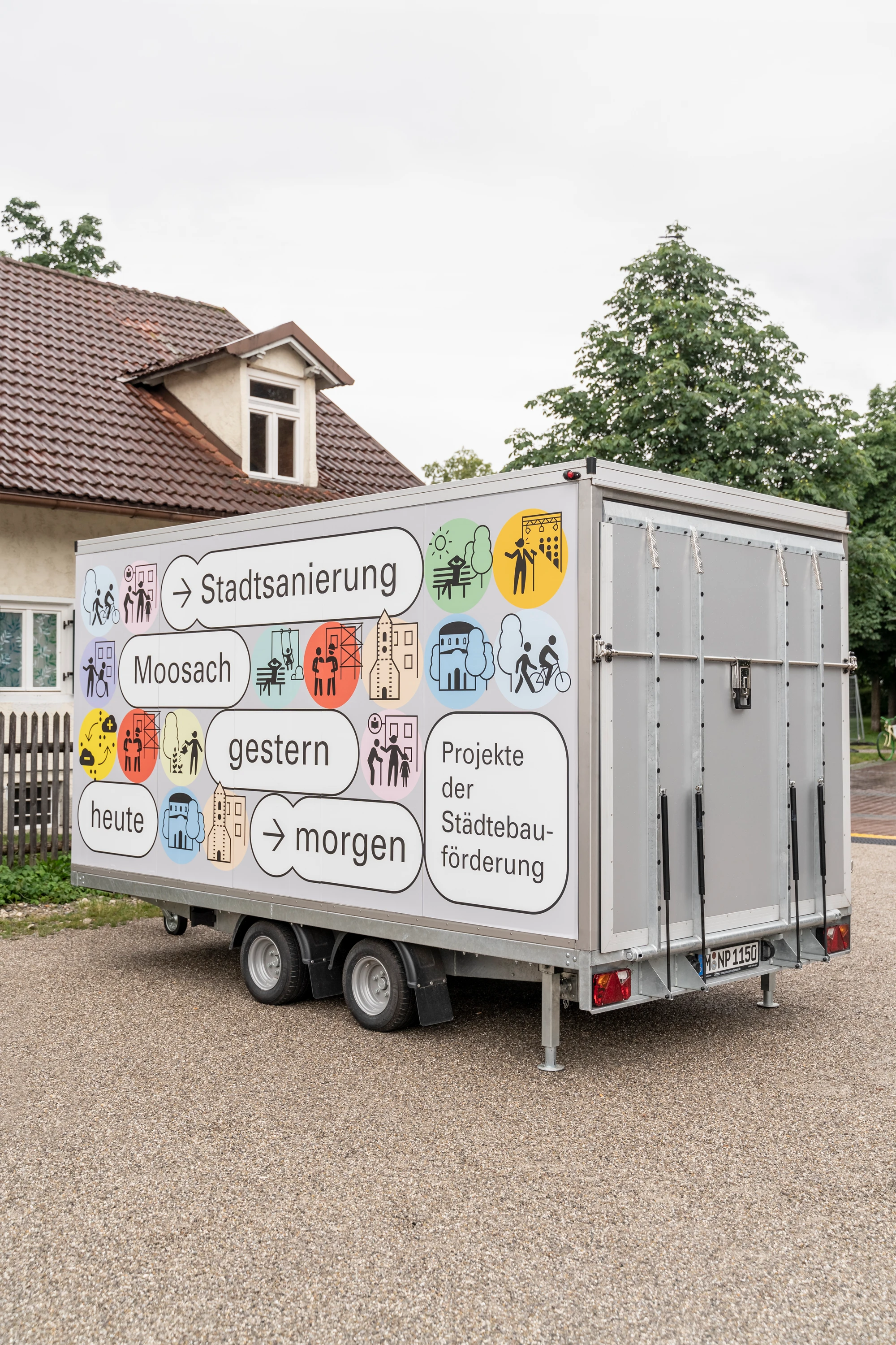 Zu diesem Zweck wurde eine Open-Air-Ausstellung mit einem Infomobil entwickelt, die im Corona-Sommer 2021 durch Moosach tourte. Das eigens hierfür entworfene Ausstellungssystem sollte mobil und wetterfest sein. Ergänzende Medien waren eine umfangreiche Broschüre und diverse Werbemittel.